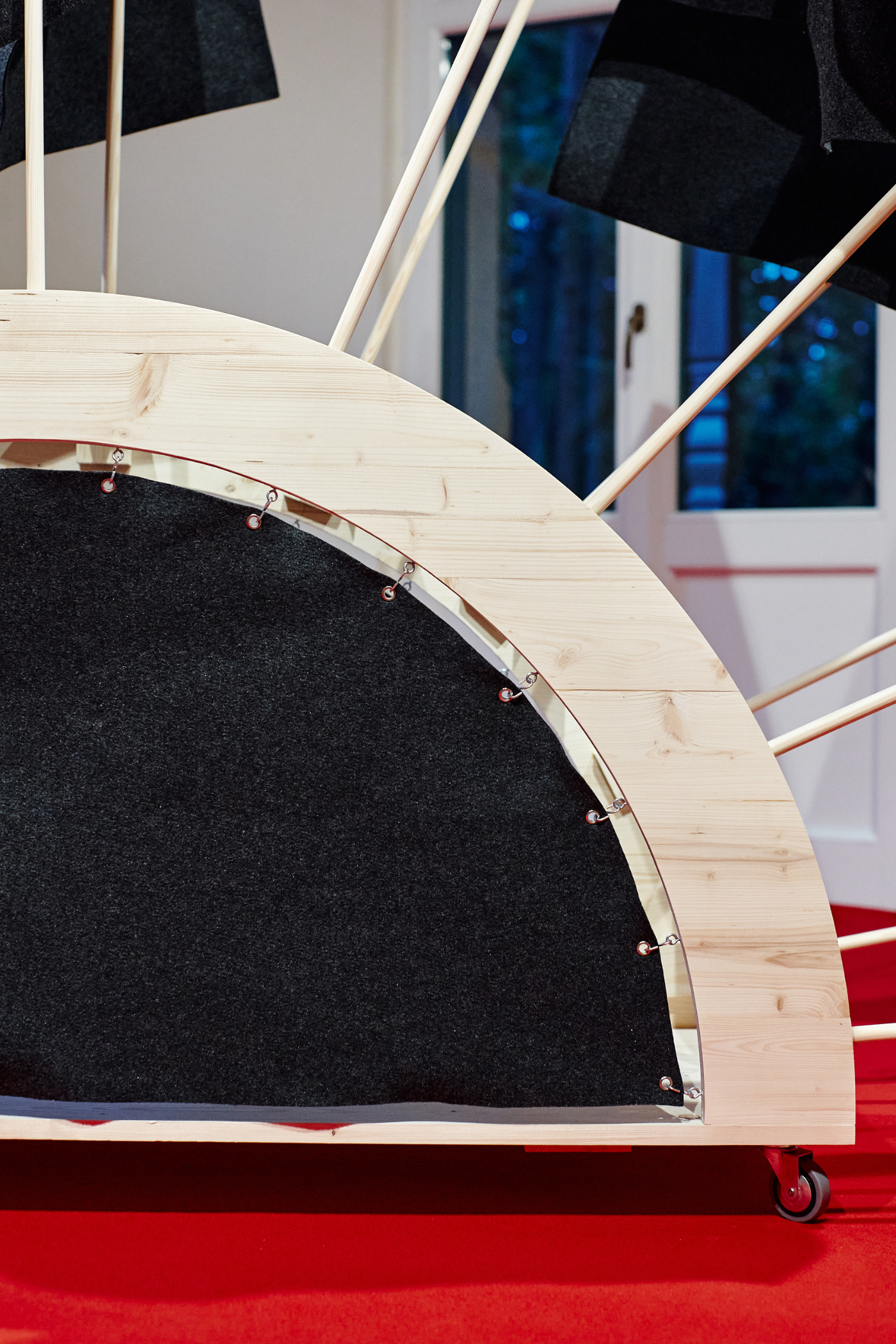 In the second room, the main work is an installation consisting of a wooden structure with flags, which by its form refers to the decoration of spaces during mass state ceremonies in Belarus. This form has stayed in the artist's memory as a symbol of the punctuated occupation of public space. The characteristic of Savashevich is the use of felt materials, which are traditionally associated with women's handiwork. Felt is one of the materials the artist often uses to create custom shapes and patterns, including large-format objects.